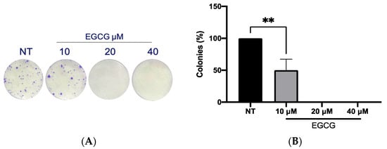 Clonogenic assay of A-431 cells incubated with 10 µM, 20 µM and 40 µM EGCG. (A) Colony formation. (B) Percentage of colonies. Each experimental group was compared with its respective control (NT). Values of p < 0.05 were considered statistically significant. ** p < 0.01. Data are expressed as mean ± SD of three biological replicates.