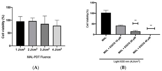 A-431 cell viability evaluated by MTT assay 24 h after treatments. (A) Intrinsic resistance to MAL-PDT of A-431 cells. (B) Effect of MAL-PDT + EGCG combination. Values of p < 0.05 were considered statistically significant. ** p < 0.01. Data are expressed as mean ± SD of three biological replicates.