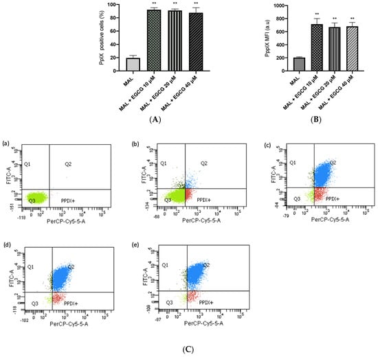 PpIX levels in A-431 cells detected by flow cytometry. (A) Cells positive for PpIX production. (B) Average fluorescence intensity of PpIX. (C) Representative flow cytometry charts: (a) autofluorescence control, (b) MAL–PDT, (c) MAL–PDT–EGCG 10 µM, (d) MAL–PDT–EGCG 20 µM and (e) MAL–PDT–EGCG 40 µM. Quadrants: Q3 (PpIX and ROS negative cells), Q4: PpIX positive cells, Q1: ROS positive cells, Q2 (PpIX and ROS positive cells). Values of p < 0.05 were considered statistically significant. ** p < 0.01. Data express mean ± SD of three biological replicates. a.u. = arbitrary units.