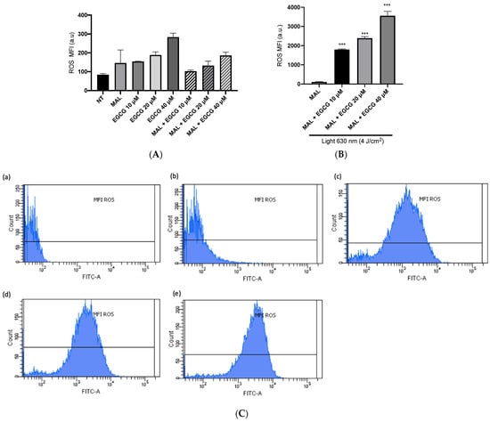 ROS levels in A-431 cells detected by flow cytometry. (A) Mean fluorescence intensity (MFI) of ROS in light-free controls of A-431 cells. (B) MFI of ROS in A-431 cells treated with MAL 2 mM and EGCG (10, 20 or 40 µM), with red light (630 nm, 4 J/cm2). (C) Representative histogram graphs: (a) autofluorescence control, (b) MAL-PDT, (c) MAL-PDT-EGCG 10 µM, (d) MAL-PDT-EGCG 20 µM and (e) MAL-PDT-EGCG 40 µM. Values of p < 0.05 were considered statistically significant. *** p < 0.001. Data are expressed as mean ± SD of three biological replicates. a.u. = arbitrary units.
