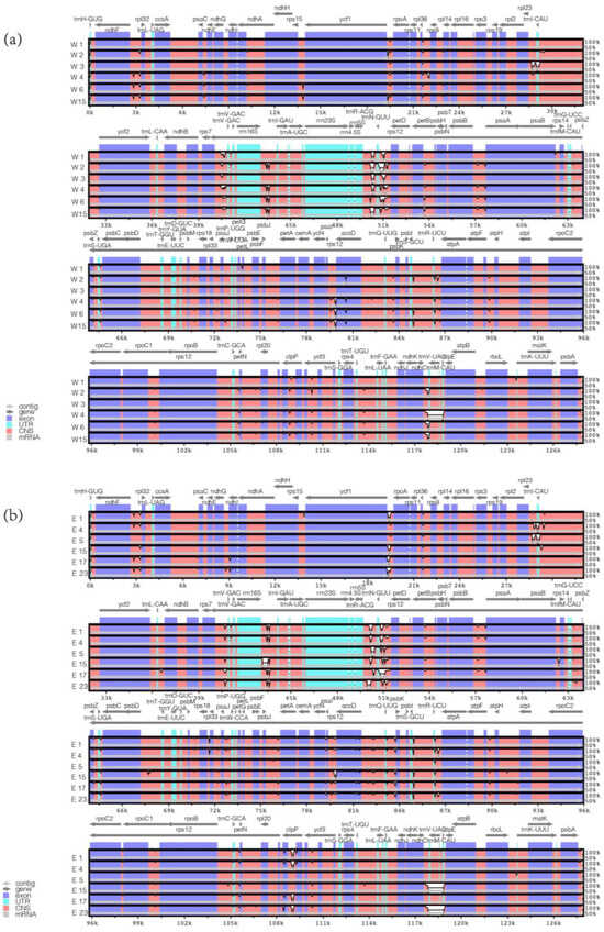 The complete chloroplast genome sequences of Medicago ruthenica were visualized with the pan-chloroplast genome as a reference. Gray arrows and thick black lines represent the orientation of genes. Purple bars indicate exons, sky-blue bars denote untranslated regions (UTRs), and red bars highlight non-coding sequences (CNS). Gray bars correspond to mRNA, while white regions show sequence differences among all analyzed chloroplast genomes. The horizontal axis shows the positions within the chloroplast genome, and the vertical scale indicates the identity percentage, ranging from 50% to 100%. (a) W1, W2, and W3 are cultivated varieties from the western region, while W4, W6, and W15 are wild varieties from the western region. (b) E1, E4, and E5 are cultivated varieties from the eastern region, while E15, E17, and E23 are wild varieties from the eastern region.
