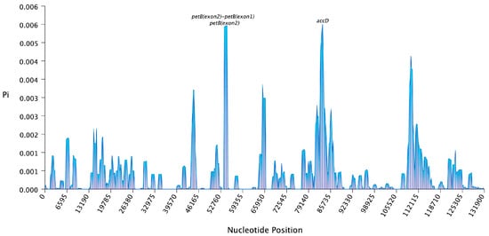 The number of insertions and deletions found in non-coding regions was higher than in other regions, which is consistent with studies related to evolutionary rates of coding and non-coding regions under selection []. Five highly variable regions were detected in the complete genome of Medicago ruthenica, namely (petB (exon2)-petB (exon1), accD-trnQ, psbZ-trnS, rrn16S-trnI (exon1), petN-rpl20), which are suitable for species identification. Similarly, psbZ-trnS has been reported as a potential molecular marker in Ilex dabieshanensis, while rbcL-accD is used for DNA barcoding in Ligustrum lucidum [,]. The coding region accD exhibits a relatively fast evolutionary rate across different species, and this gene is commonly used as a chloroplast DNA barcode. Additionally, accD-trnQ shows high variability among alfalfa populations from different regions, indicating that its non-coding sequences may further facilitate the phylogenetic analysis and variety identification of Medicago ruthenica from different geographical areas.