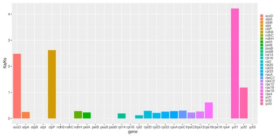 The Ka/Ks ratio is widely used to measure selective pressure and is associated with gene adaptive evolution []. Compared to non-synonymous (KS) substitutions, synonymous (KA) nucleotide substitutions are more frequent in most genes of organisms, so the Ka/Ks value is typically less than 1 [,]. A Ka/Ks ratio greater than 1 indicates positive selection, while a Ka/Ks ratio less than 1 indicates purifying selection []. In this study, the Ka/Ks ratio of most protein-coding genes was less than 1, indicating that they were under purifying selection. Additionally, the detection results indicate that four genes are strongly positively selected (accD, clpP, ycf1, ycf2). Non-synonymous substitutions can induce changes in amino acids, driving alterations in gene function to adapt to environmental pressures []. The results of this study showed that four genes (accD, clpP, ycf1, ycf2) were under positive selection. The analysis results of KS and KA rates showed that the ycf1 had the highest average Ka/Ks ratio in the chloroplast genome of Medicago ruthenica. Similar to most plant studies, ycf1 and ycf2 are among the longest genes in the chloroplast genome, present in almost all plant chloroplasts, and can also identify different varieties in orchids and cucumbers [,]. ClpP encodes the caseinolytic protease complex, which plays an essential role in maintaining protein homeostasis and includes both plastid-encoded and nuclear-encoded subunits []. The accD encodes the β-carboxylase enzyme, which is a key enzyme in the biosynthesis of fatty acids. The matK, ycf1, accD, rps3, and rpoA were observed to positive selection in Juglans []. Therefore, the positive selection observed in these genes across different varieties indicates that they are undergoing rapid evolution []. Further research into their functions could be crucial for understanding the adaptive evolution and breeding of Medicago ruthenica.