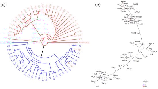 - Leigh, J.; Bryant, D.; Nakagawa, S. POPART: Full-feature software for haplotype network construction. Methods Ecol. Evol. 2015, 6, 1110–1116. [Google Scholar] [CrossRef]