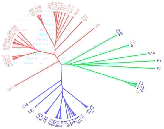 With the rapid development and improvement of sequencing technologies and analytical approaches, an increasing number of chloroplast genome data have been successfully utilized in phylogenetic studies [,,]. Using 61 chloroplast genomes, we reconstructed a phylogenetic tree within Medicago ruthenica, and results were supported by the genomic clustering analysis conducted by Wang et al. and Yin et al. [,]. In the classification of Medicago ruthenica, wild and cultivated varieties are clearly separated. E1 and E4, as well as E8 and other varieties, were divided into two separate branches, which are closely related to wild species. E6 and E9 were grouped into an independent branch, indicating a closer relationship between these two cultivated varieties compared to other wild cultivated varieties (Figure 5a and Figure 6). The classification of W1 and W3 varieties from Gansu Province together with those from the eastern region may be due to the self-incompatibility of Medicago ruthenica, which leads to extensive hybridization and gene flow among different varieties []. As a result, certain varieties may not be classified according to their geographical regions. The results indicate that studying species relationships based on complete chloroplast genome data is reliable at the intra-specific level. However, the phylogenetic relationships based on variant sites differed from those based on complete chloroplast genomes, grouping some eastern region of Inner Mongolia varieties with Hebei and Xian, forming a Central region. All alfalfa varieties are thus divided into three categories: eastern, central, and western. This is likely due to the eastern region’s chloroplast genomes containing more variability, as evidenced by the higher number of haplotypes observed in the eastern region.