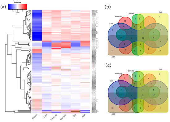 (a) Heatmap of chloroplast gene expression in Medicago ruthenica under abiotic stress. (b) Number of upregulated genes under different abiotic stresses. (c) Number of downregulated genes under different abiotic stresses.