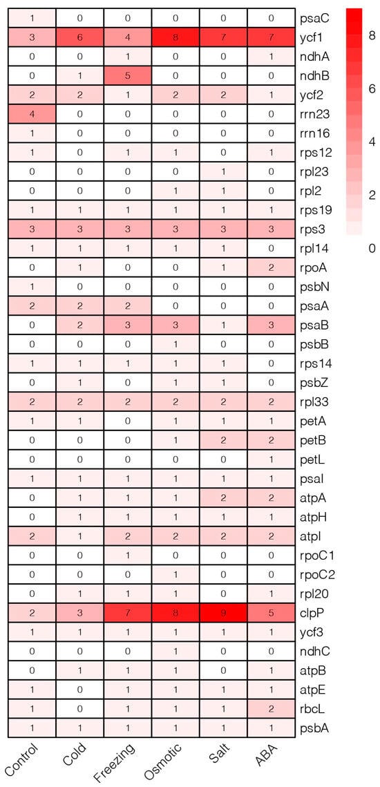 By combining transcriptome data, 21 editing events were identified in Medicago ruthenica under control (Figure 8, Table S7). Under abiotic stress, 34 editing events were identified through RNA-Seq mapping, with a potential of 214 RNA editing sites. Among these, C-to-A and C-to-T were the main editing events, with ycf1 and clpP having the most editing events. Compared to the control, the RNA editing efficiency of psaB, atpA, and atpH significantly increased under abiotic stress. This result suggests that RNA editing may be related to the synthesis and function of protease subunits and ATP synthase subunits.