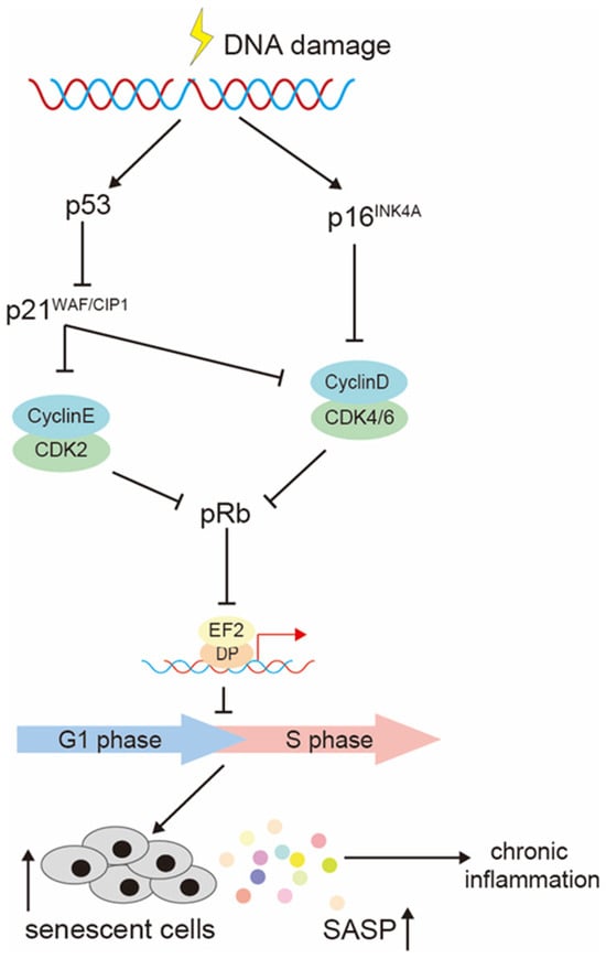 Figure 1, DNA damage caused by aging stress or physiological processes activates p53, which in turn activates the CDK2 inhibitor p21