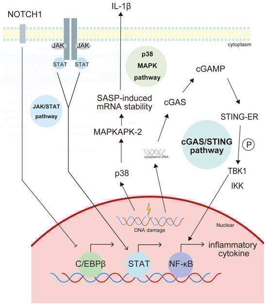 26]. SASP involves a complex network of signaling pathways that regulate the secretion of various factors by senescent cells. For example, as shown in