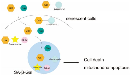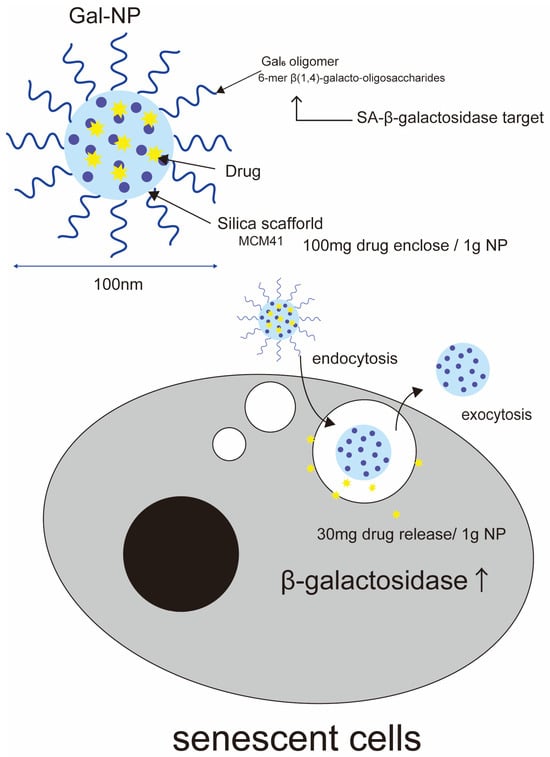 Figure 3). The drug delivery mechanism of this drug is as follows: a substantial proportion of senescent cells exhibit elevated levels of β-galactosidase activity. The targeted delivery of selected drugs to high levels of β-galactosidase in aging cells is achieved through the use of galactooligosaccharide-coated porous silica scaffolds. The system is degraded by the hydrolytic enzyme β-galactosidase, which is present in senescent cells, resulting in the release of the drug. The efficacy of this approach has been demonstrated in vitro in palbociclib-induced senescence with CDK6/CDK4 inhibitors in responding cancer cells and in vivo in palbociclib-induced senescence in tumor grafts and bleomycin-injured lungs, where preferential release of the encapsulated drug has been demonstrated. β-Gal digests the sugar coating of the beads and releases the drug from the silica scaffold. Generally, 100 mg of drug can be encapsulated in each gram of beads. Moreover, approximately 30 mg of drug is released per gram of beads when digested in vitro. Gal-NP beads have a particle size of approximately 100 nm; these can be taken up by senescent cells through endocytosis, and the bead portion is exocytosed after fusion with lysosomes.