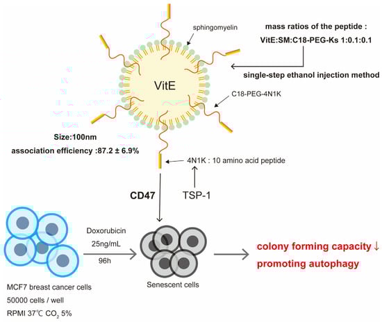 Myc, which binds to the CD47 promoter and suppresses CD47 expression, thereby avoiding senescence. Derivatives of the C-terminal domain of TSP-1, designated 4N1Ks, have been demonstrated to stimulate autophagy in senescent and cancerous cells, while simultaneously impeding their evasion from senescent cells. We have targeted CD47 using nanoparticles modified with C18-PEG-Ks, in which the 4N1Ks are connected to PEG by a carbon chain (C18). The nanoparticles to be coated exhibit good biodegradability and therapeutic compatibility with sphingomyelin, which is present in cell membranes, and vitamin E, which is commonly used for encapsulation of various therapeutic molecules. The efficacy of DDSs in this paper is demonstrated in in vitro experiments on MCF7 breast cancer cells, with targeting to CD47 by 4N1Ks derived from the C-terminal domain of TSP-1 against chemically induced senescent cells using doxorubicin. In doxorubicin senescence-induced MCF7 breast cancer cells, a peptide dose of 0.5 μM has been shown to significantly reduce the number of cancer cell colonies compared to untreated and 4N1K blank groups. This system is relatively easy to prepare, involving a one-step ethanol injection method, and exhibits excellent colloidal properties, low cytotoxicity, and high cell internalization. Process reproducibility and scalability are enhanced by this efficient and simple ethanol injection method. The use of biodegradable and biocompatible components, such as sphingomyelin and vitamin E, in SN formulations ensures system safety and stability for drug delivery applications. In terms of physicochemical properties, the average particle size is reported to be approximately 108 nm, and the SNs-Ks association efficiency (the percentage of peptides associated with the nanosystem) is 87.2 ± 6.9%. These physicochemical properties contribute to the efficacy of nanosystems for the targeted delivery of drugs to aging cells.