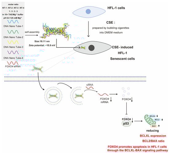 To prepare siFOXO4-NTs, computer programs such as SEQUIN were used to design four unique DNA strands that are mixed in a specific molar ratio and self-assemble into a nanotube structure. In summary, this study shows that self-assembling DNA nanotubes loaded with FOXO4 siRNA can selectively and effectively reduce FOXO4 levels in senescent fibroblasts, suggesting a new approach for COPD treatment.