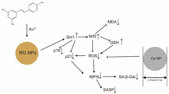 11] are gold nanoparticle systems encapsulating resveratrol, an antioxidant polyphenol, as an anti-aging agent to delay cataracts. The mechanism of action of RGNPs is the activation of the Sirt1/Nrf2 pathway in the body, which significantly reduces oxidative damage (