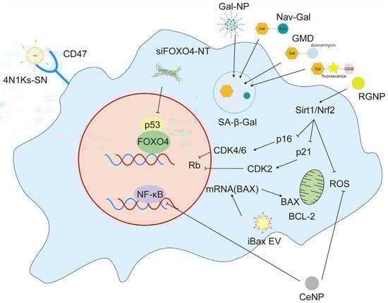FOXO4 -NTs have been reported as DDSs that silence FOXO4 induced by tobacco smoke with siRNA and reduce and eliminate increased BCLXL and BCL2/BAX ratios in SCE-induced senescent HFL-1 cells [