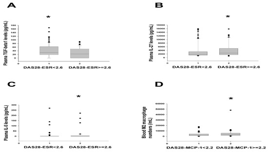 Different cytokine levels or M2 macrophage numbers across DAS28-based remission statuses: (A–C) Plasma TGF-β1, IL-27, and IL-5 levels significantly differentiated DAS28-ESR < 2.6 (n = 98) from DAS28-ESR ≥ 2.6 (n = 49, having higher values for IL-27 and IL-5) at p = 0.037, 0.025, and 0.028, respectively. (D) The number of M2 macrophages in the blood discriminated DAS28-MCP-1 < 2.2 (n = 79) from DAS28-MCP-1 ≥ 2.2 (n = 68, having higher M2 macrophage numbers) at p = 0.036. All comparisons were conducted using the Mann–Whitney U test. * Asterisks indicate the subgroup had significantly higher cytokine levels or M2 macrophage numbers than another subgroup.