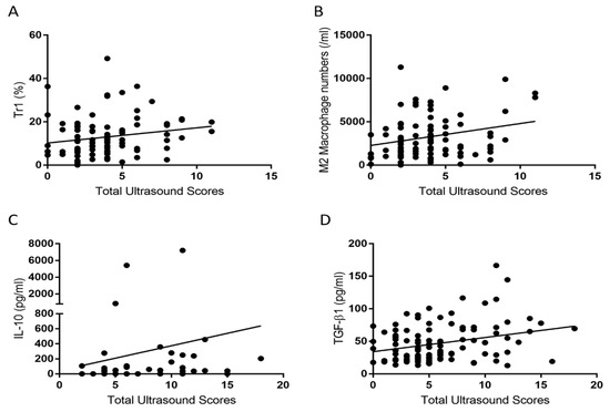 This study revealed that TGF-β1 levels were significantly and positively correlated with Total Ultrasound Scores (the sum of ultrasound grades for grayscale and power Doppler of all examined joints), although the correlation coefficient was low (Table 5 and Figure 2D). Ultrasound grades were assessed by employing the EULAR-OMERACT scoring system [20]. Tr1 cells and M2 macrophages positively correlated with Total Ultrasound Scores in the low ultrasound grade subgroup (≤1) (Table 6 and Figure 2A,B). In contrast, IL-10 positively correlated with Total Ultrasound Scores in the high ultrasound grade subgroup (>1) (Table 6 and Figure 2C). Plasma IL-5 levels revealed an inverse relationship with Total Ultrasound Scores (Table 6).