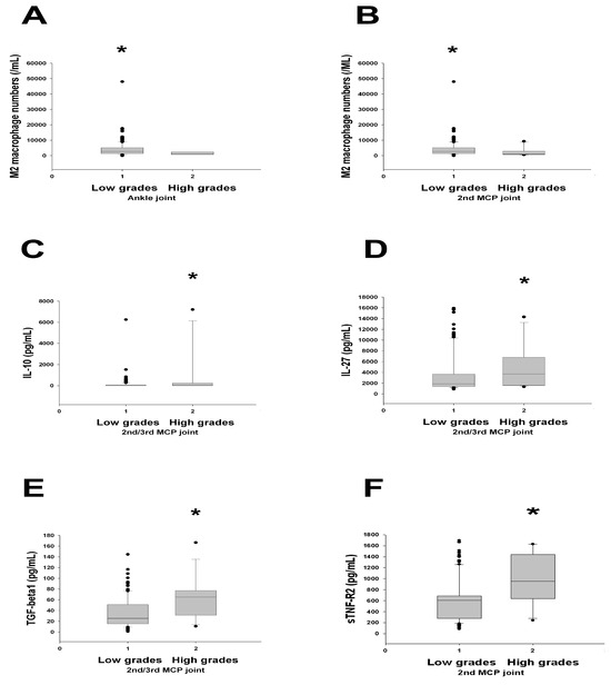 Comparison of M2 macrophage numbers and immunoregulatory cytokines between two groups with ultrasound grades for individual joints. Ultrasound grades were scored as described in a previous study [20]: (A) The number of M2 macrophages in the group with low ultrasound grades (grades 0 and 1) (n = 140) was higher than that in the group with high ultrasound grades (grades 2 and 3) (n = 7) for the ankle joint (p = 0.038). (B) The number of M2 macrophages in the group with low ultrasound grades (n = 137) was higher than that in the group with high ultrasound grades (n = 10) for the 2nd metacarpo-phalangeal (MCP) joint (p = 0.027). (C) IL-10 levels in the group with high ultrasound grades (n = 15) were higher than those in the group with low ultrasound grades (n = 132) in the second MCP joint (p = 0.038). (D) IL-27 levels in the group with high ultrasound grades (n = 15) were higher than those in the group with low ultrasound grades (n = 132) in the second and third MCP joint (p = 0.002). (E) TGF-β1 levels in the group with high ultrasound grades (n = 15) were higher than those in the group with low ultrasound grades (n = 132) for the second and third MCP joints (p = 0.007). (F) sTNF-R2 levels in the group with high ultrasound grades (n = 10) were higher than those in the group with low ultrasound grades (n = 137) in the second MCP joint (p = 0.010). All comparisons were conducted using the Mann–Whitney U test. * Asterisks indicate the subgroup had significantly higher cytokine levels or M2 macrophage numbers than another subgroup.
