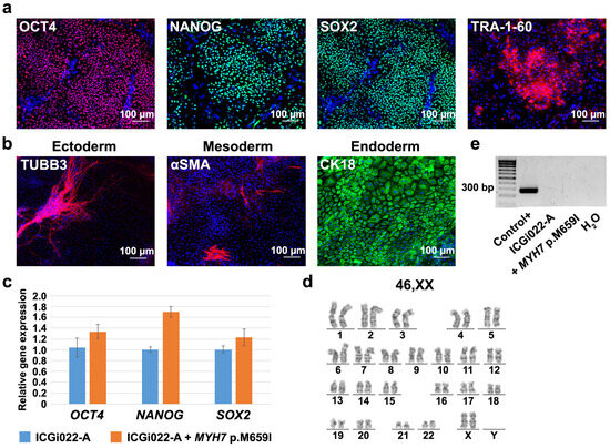 The iPSC line with the p.M659I (c.1977G > A) mutation, which was introduced with CRISPR/Cas9 in MYH7, retained pluripotent properties: expressed pluripotency markers, such as the OCT4, NANOG, SOX2 transcription factors and TRA-1-60 surface antigen, and gave rise to derivatives of three germ layers during spontaneous differentiation in embryoid bodies (Figure 2a,b). The expression level of OCT4, NANOG, and SOX2 in the iPSC line was comparable to that in the original ICGi022-A line used for MYH7 editing (Figure 2c). The iPSC line with the introduced p.M659I (c.1977G > A) mutation in MYH7 also had a normal karyotype (46,XX (Figure 2d)) and was negative for mycoplasma contamination (Figure 2e).