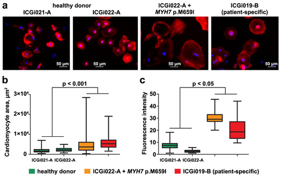 One of the most common HCM features in iPSC-based models of the disease is an enlarged size of cardiomyocytes [5,6,7,9,10,30]. The cardiomyocytes derived from the iPSCs with the introduced p.M659I (c.1977G > A) mutation in MYH7, patient-specific iPSCs, and iPSCs from healthy donors were visualized by immunofluorescence staining with antibodies to sarcomeric α-actinin, a cardiomyocyte-specific marker (Figure 3a). The calculation of iPSC-derived cardiomyocyte areas showed that the cardiomyocytes carried the p.M659I (c.1977G > A) mutation in MYH7 (introduced with CRISPR/Cas9 or patient-specific) had an increased size in comparison with those differentiated from the iPSCs of healthy donors (Figure 3b).