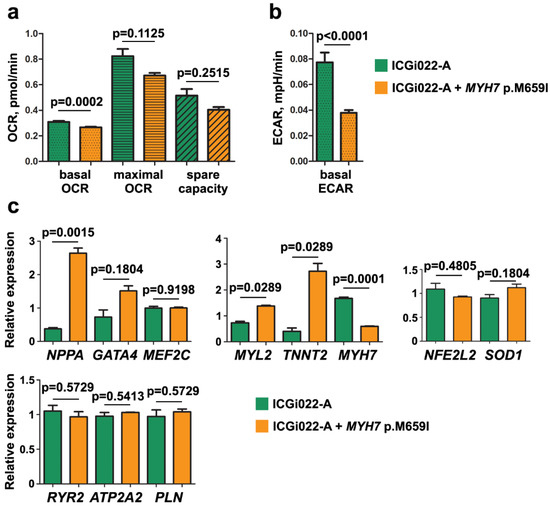 A disruption of mitochondria functioning was also found in some iPSC-based HCM models [14,19,20]. We assessed mitochondrial respiration (oxygen consumption rate, OCR) in cardiomyocytes derived from the iPSC line with the introduced p.M659I (c.1977G > A) mutation in MYH7 and the original ICGi022-A line (healthy donor) using Seahorse technology (Agilent, Santa Clara, CA, USA). To study mitochondrial respiration, the protocol of cardiac iPSC differentiation was modified. After metabolic selection, cardiomyocytes were cultured for 2 weeks in the presence of 2 µM CHIR99021 and for another 2 weeks in a medium for cardiomyocyte maturation, which contained low glucose and high oxidative substrate concentrations [32]. In iPSC-derived cardiomyocytes with the introduced p.M659I (c.1977G > A) mutation in MYH7, basal OCR was significantly lower than in those of the healthy donor (p-value = 0.0002). At the same time, no differences in the maximal OCR and spare capacity were revealed (Figure 4a). Extracellular acidification rate (ECAR) reflecting glycolysis level was also investigated. Basal ECAR was decreased in iPSC-derived cardiomyocytes with introduced p.M659I (c.1977G > A) mutation in MYH7 compared to those of the healthy donor (p-value < 0.0001) (Figure 4b).