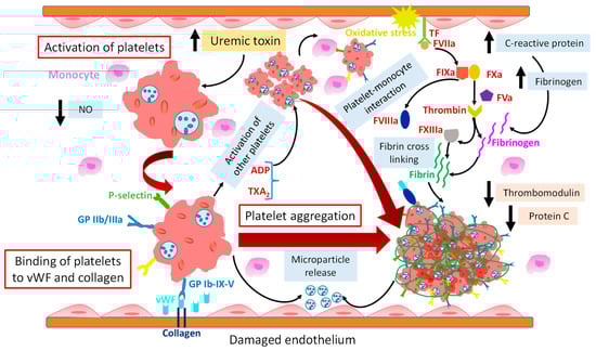 Platelets play a key role in hemostasis [], and their hyper or hypo reactivity may be involved in the development of thrombotic or hemorrhagic complications in patients with CKD []. High platelet activation and aggregation are key factors in thrombus generation in CKD (Figure 2) [,]. vWF and collagen are unveiled on the subendothelial surface upon endothelial dysfunction. Receptors on the platelet surface, such as GPIb-V-IX and GPVI, are involved in platelet adhesion to vWF and collagen, respectively, to promote thrombus formation []. The binding of fibrinogen with platelets is mediated by activated integrin αIIbβ3 (GP IIb/IIIa), which induces platelet aggregation. In order to increase thrombus formation, activated platelets recruit other circulating platelets by releasing mediators such as adenosine diphosphate (ADP) and thromboxane A2 (TXA2). In addition, exposed TF on disrupted vessel walls triggers thrombin generation, which consequently converts fibrinogen to fibrin to form a stable clot [,]. However, in CKD patients, the reduced platelet adhesion is followed by endothelial dysfunction, which elevates the coagulation factors and decreases fibrinolytic activity, with a consequent increase in thrombotic risk [,]. Clinical studies revealed that platelet activation increases with the progression of kidney impairment [].