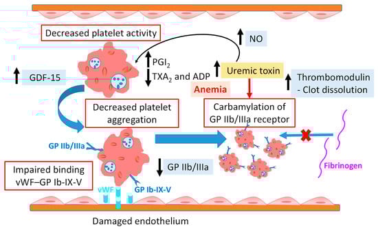 Anemia is related with a developing tendency of thrombosis and bleeding risk as well. In anemic CKD patients, the abnormal activation of PGI2, low production of ADP, and altered interaction of platelet–vessel wall increase the hemorrhagic risk. In addition, the increase in NO levels in anemic renal failure hinder platelet aggregation, therefore increasing bleeding tendency in patients []. The synergistic effect of anemia and CKD imposes a worsening effect of platelet abnormalities []. Reduced erythrocyte number contributes both to bleeding and thrombotic risk by impairing the interaction of platelets with the vessel wall and less scavenging of NO, respectively. Reduction in erythrocyte number with CKD progression resulted from decreased erythropoietin synthesis, inhibition of erythropoiesis by uremic toxin, and lower lifespan of uremic erythrocytes. There is a negative correlation between red blood cell count and bleeding time [,].