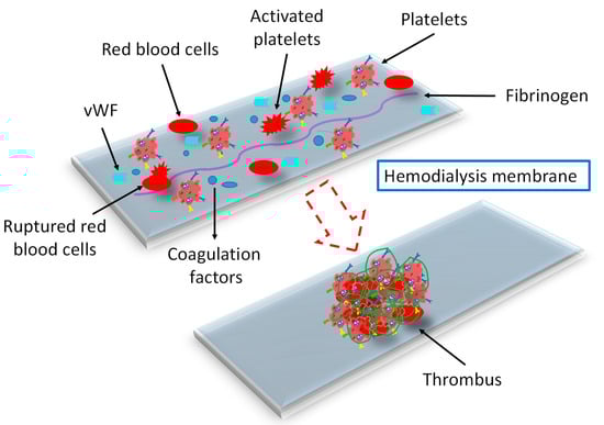 HD and PD are the most common treatments for patients with ESRD to eliminate uremic toxins. Accumulation of these toxic substances causes hemostasis alteration and CV complications []. The frequent exposure of blood to the extracorporeal medical device enhances bleeding risk due to absorption of coagulation factors, shear mediated acquired von Willebrand disease, and platelet absorption and dysfunction []. Bleeding risk is higher in dialysis patients than in non-dialysis controls; particularly, gastrointestinal bleeding is common among major bleeding events []. Various HD procedures may affect platelet function, oxidative stress, and hemostasis in different ways. For these reasons, using different dialysis membranes may also diversely influence the whole hemostasis mechanism, explaining the discrepancy in data related to HD and its influence on platelet function and homeostasis []. The hemoincompatible membranes alter the platelet morphology to irregular shape and pseudopods []. Rupturing of red blood cells during HD, due to a rough surface, results in the lysis of hemoglobin and platelets and induces platelet adhesion and protein adsorption, which stimulate the coagulation cascade to form a thrombus (Figure 4). The high shear stress during HD triggers the release of platelet MPs. Endothelial MPs concentration was an independent risk factor for CV and all-cause mortality in patients who underwent polysulphone and AN69 dialyzers []. Dialyzer membrane stress on platelets increases the release of platelet factor 4 from platelet granules, which enhances thrombus formation by avoiding inactivation of thrombin [,]. After adsorption on the dialyzer membrane, the plasma proteins, such as albumin, immunoglobulin G, fibrinogen, fibronectin, factor XII, and vWF, undergo conformational changes, which consequently result in the activation of platelets and leukocytes, activation of the complement system, blood coagulation, chronic inflammation, oxidative stress, and thrombosis [,]. The conformational changes in fibrinogen and vWF uncover more binding domains to platelets and leukocytes. The conformational changes in FXII after adhering to the membrane surface trigger the initiation of the intrinsic coagulation pathway to enhance thrombus formation. In certain conditions, conformational changes in fibrinogen may mask the platelet binding site and inhibit platelet adhesion and activation [,,]. Fibrinogen triggers aggregate formation of red blood cells despite low hematocrit levels, which results in defective blood flow and perfusion in the microvasculature during dialysis []. The interaction of blood with the membrane, inducing various biological reactions, controls the clotting time, thrombogenic tendency, and the whole mechanism []. Nosseir et al. [] reported that the decreased level of protein C in ESRD-HD patients could be due to the interaction between blood and the dialyzer membrane. Plasma fibrinogen synthesis increases in patients on long-term PD, probably due to the loss of albumin in peritoneal dialysate and the accumulation of fatty acids in blood []. The study of De Laval et al. [] revealed an increased level of platelet, endothelial, and monocyte MPs in patients treated with low-flux compared with high-flux membranes. The authors suggested that the lower production of MPs in high-flux dialyzers could be due to their greater abilities to perform clearance of middle molecules. Complement activation has been reported to be involved in triggering MP release. However, high-flux HD significantly removes complement factors C3a and C5a by filtration and/or adsorption. Uremic toxins also contribute to stimulating MP formation from endothelial cells. The protein binding affinity of these toxins make HD removal less effective, with high discrepancy between different dialyzer types [].