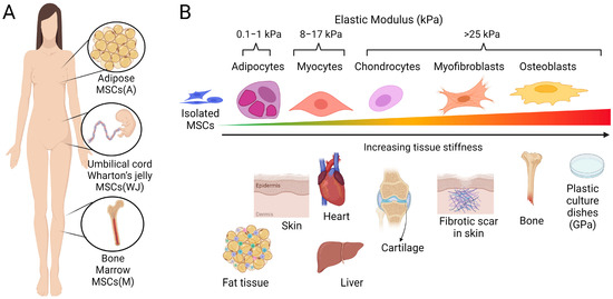 Tissue sources of therapeutic MSCs and stiffness-dependent differentiation. (A) The most prominently used tissue sources to isolate therapeutic MSCs from human biopsies include adipose tissues, bone marrow, and umbilical cord Wharton’s jelly. (B) The mechanical properties, i.e., softness or stiffness of tissues and those of the culture substrates used to grow and expand adhesive MSCs can influence MSC differentiation capacity and fate. MSCs cultured in soft cell culture environments matched to the elastic modulus (indicated in kPa) of normal fat and muscle tissue exhibit a high propensity for adipogenic and myogenic differentiation. In contrast, growth on stiffer culture substrates promotes the lineage commitment of MSCs towards cartilage and bone. One MSC fate, either representing a transitional state to osteogenesis or an independent scar-forming phenotype, is the activation of MSCs into fibrogenic myofibroblasts. Notably, the scars forming in response to the injury of soft tissues are always stiffer than the normal tissue texture (here schematized for skin), which drives the mechanically induced myofibroblast activation from resident and delivered mesenchymal cells. Cell culture plastic dishes are even stiffer (~10,000-times) than the stiff scar, which results in MSC-to-myofibroblast activation in vitro. Scheme produced with Biorender.