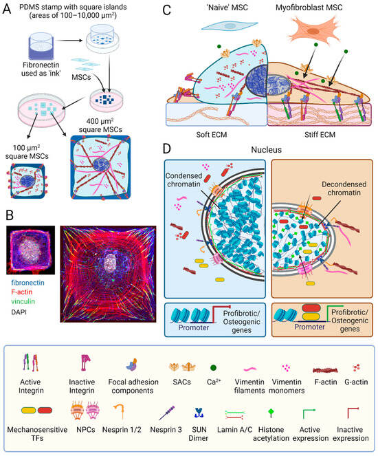 MSC mechanoperception and nuclear mechanics. (A) The spreading area of mesenchymal stromal cells (MSCs) attaching to an adhesive substrate can be controlled using micropatterning; for instance, by transferring fibronectin protein (blue staining) in square shapes of different areas onto glass or plastic substrates using polydimethylsiloxane (PDMS) stamps. (B) Restricting MSC spreading limits the number and size of focal adhesions (green vinculin staining) and F-actin stress fibers (phalloidin, red), thus overall reducing MSC stress. (C) Another way to reduce stress on MSCs in culture is manipulating the elastic modulus of their substrate. MSCs perceive mechanical cues from the extracellular matrix (ECM) via transmembrane integrins; binding to extracellular ligands and intracellular F-actin shifts integrins from a low affinity inactive to a high-affinity active configuration. This integrin conformational switch prompts the assembly of complex focal adhesion structures comprising the cytosolic proteins talin, vinculin, focal adhesion kinase, paxillin, and filamin. Focal adhesions serve as hubs for mechanotransduction pathways, orchestrating the polymerization of G- into F-actin and the organization of vimentin monomers into intermediate filaments. Mechanical stress also opens stretch-activated channels (SACs) to allow the influx of Ca2+ into the cytosol to trigger distinct signaling cascades. (D) The nuclei of MSCs grown on stiff surfaces are characterized by higher lamin A:C ratios in the inner nuclear membrane, more decondensed chromatin and higher histone acetylation compared to soft environments. A direct connection between ECM adhesions and the nucleus is established through the nucleoskeleton and cytoskeleton complex (LINC), containing nuclear envelope spectrin repeat proteins (nesprins) and Sad1p and UNC-84 homology (SUN) proteins that span the nuclear envelope. Nesprin-3 attaches SUN proteins to F-actin, whereas nesprins-1 and -2 link to intermediate filaments. Within the inner nuclear membrane, SUN dimers interact with lamin A bound to chromatin, causing organized DNA to unfold under high mechanical stress. High stress enhances the nuclear translocation of mechanosensitive transcription factors, such as MRTF-A, Runt-related transcription factor 2 (RUNX2), Yes-associated protein (YAP), and transcriptional coactivator with PDZ-binding motif (TAZ) via opening of the nuclear pore complex (NPC). The promoter binding of these transcription factors drives the expression of pro-fibrotic and osteogenic genes. Scheme elements produced using Biorender, immunofluorescence images produced by Nicole Berezyuk (Hinzlab).