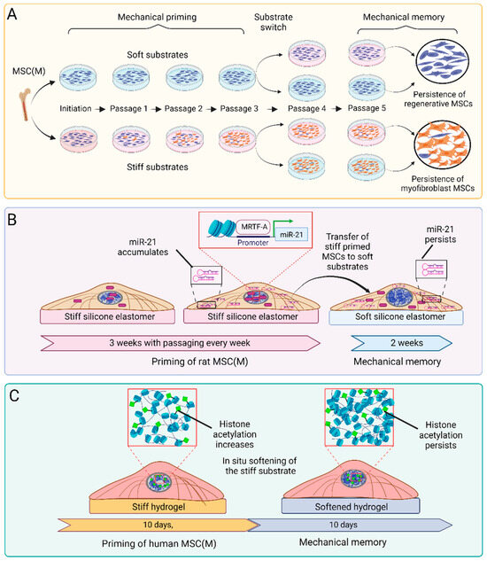 Imprinting desired functional MSC features epigenetically during the pivotal cell culture expansion is another strategy that has great potential to enhance MSC performance after transplantation [85,322]. As an alternative to cell culture priming in the defined mechanical conditions discussed above, mechanically induced epigenetic memory is possibly altered or erased by targeting the molecular mechanisms of memory formation. Above, we have already discussed acute mechanosensitive transcription factors and epigenetic modifiers that are involved in the acquisition and maintenance of mechanically induced MSC memory, including MRTF-A/MLK-1 [125], YAP/TAZ [125,301,311,312,323], miR-21 [125], HATs, and HDACs [301] (Figure 3). While not all studies establish a direct connection between the mechanical environment of cultured plastic dishes and epigenetic memory, manipulating epigenetic modifications of conventionally cultured MSCs, such as DNA methylation, was shown to enhance their immunomodulatory and regenerative capabilities [324,325]. In our own studies, knocking down the myofibroblast memory keeper miR-21 restored the ability of 3-week stiff-primed MSCs to lose myofibroblast features and regain regenerative capabilities after a subsequent switch to soft substrates. Such stiff memory-erased MSCs improved the healing of hypertrophic rat wounds, such as 3-week soft-primed MSCs [125].