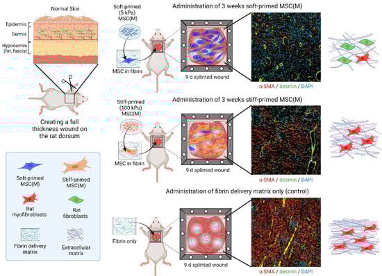 One may argue that the study of MSC mechanical priming and memory has mere academic value. However, in a clinical context, MSCs are typically expanded for 3–5 passages before enough cells are produced for a transplant, which is sufficient time to generate lasting in vitro memory. Or, in other words, build up resistance against the pro-fibrotic environment of the host wound environment. Indeed, the therapeutic potential of mechanically priming MSCs during the culture expansion phase has been shown using animal models of fibrotic healing. Rat MSC(M) directly explanted and then primed for three weeks on 5 kPa skin-soft substrates stimulated better wound healing outcomes in a rat hypertrophic model of skin wound healing compared to the delivery of 100 kPa scar-stiff-primed or culture plastic-expanded MSCs (Figure 4). Typical scar features such as poor vascularization, excessive accumulation of myofibroblasts, dense collagen, and high wound tension were all suppressed by the therapeutic soft-primed MSCs [125]. Similarly, MSCs(A) cultured on 1 kPa fat-soft substrates for 2 weeks promoted tissue regeneration after delivery into an inflammatory environment in a case of post-traumatic elbow contracture [311]. In both models, it remains to be shown whether the delivered MSCs directly contribute to the production and remodeling of wound ECM, i.e., whether their culture-acquired myofibroblast state matters. Alternatively, mechanical priming in vitro may also alter MSC secretomes and, thus, how such MSCs instruct the host inflammatory and fibroblastic cells via trophic actions in the wound bed. It also remains to be shown whether and for how long mechanical MSC memory persists after tissue delivery.