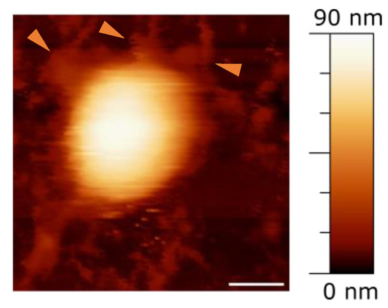 The initial experiments focused on assessing the basic morphological features of the viruses, e.g., their shape and height. Typically, we expect to observe round objects, decorated with viral proteins protruding from the surface, consistent with the structure of SARS-CoV-2 [33]. Figure 1 displays a typical Atomic Force Microscopy (AFM) image of an intact viral particle, where remnants of spike proteins can be seen on the round surface (arrows in Figure 1). At a distance from the particle, other irregular formations are visible, that may be identified with debris from damaged particles, such as proteins, RNA, or fragments of the viral envelope, likely a result of the inactivation process. It is improbable that these irregular objects are due to the poly-L-lysine substrate, as it has been verified to be quite flat and smooth, with minimal impurities, typically less than 5 nm in height.