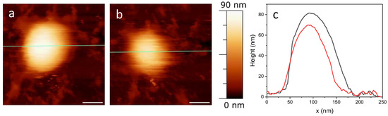The typical result of a fatigue experiment is shown in Figure 2, which effectively summarizes the findings from multiple tests we performed. Specifically, Figure 2a presents the initial image, and Figure 2b shows the final one from the fatigue test. These images were taken at a force of 50 pN, and the experiment lasted about 70 min, during which 24 images were captured. Analysis of the images and the line profile shown in Figure 2c indicates that the virus did not completely break. Instead, it appears to have lost some material, as evidenced by a height reduction of about 10 nm. This outcome is particularly significant, as viruses with protein shells usually disassemble more distinctly in such measurements [36]. Conversely, the presence of a phospholipid envelope may confer a degree of pleomorphism to the virions, enabling them to alter their structure under mechanical stress without fully collapsing.