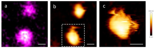 Particularly, we stained the viral particles with an RNA-binding fluorophore, Syto13 to check if the genetic material was colocalizing with the viral particles. The AFM microscope from JPK that was available for correlative imaging did not allow any gentler Quantitative Imaging (QITM), therefore tapping mode in liquid [44] was the choice modality. In the tapping mode, the cantilever oscillates at its resonance frequency. As the tip approaches the sample surface, it lightly “taps” the surface at the bottom of its oscillation cycle. This modality is not ideal for our sample, because the lateral forces are not negligible. Anyway, despite experiencing some dragging in the virions, we were able to find some correlations. Figure 3 is an example of correlation between the fluorescence signal coming from the viral RNA (Figure 3a) and the AFM topography map that we found (Figure 3b). Interestingly, the RNA is localized also on partially damaged virions (Figure 3c), showing that viruses that look damaged but not completely disrupted appear to retain their genetic material.