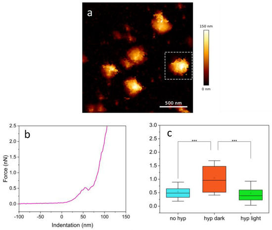 (a) QITM image of a few viral particles. A dashed square indicates the particle used for the breakthrough measurement reported in (b). Such graph displays the acquired force–distance curve showing visible penetration of the external viral envelope; (c) breakthrough force distributions under three different conditions with [Hyp] = 1 μM, asterisks indicate p value < 0.001.