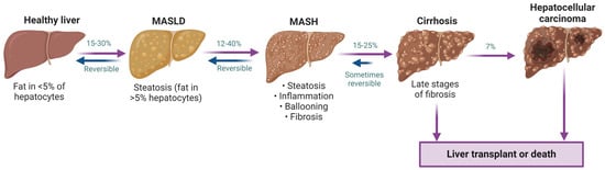Spectrum of MASLD progression. Due to obesity, lifestyle or other factors, a healthy liver may become steatotic (TG present in >5% of hepatocytes). Steatohepatitis can develop from steatosis with the addition of inflammatory insults. Both MASLD and MASH are often reversible, while cirrhosis may partially regress with treatment. Otherwise, this can lead to hepatocellular carcinoma and may ultimately require liver transplantation [9,10].