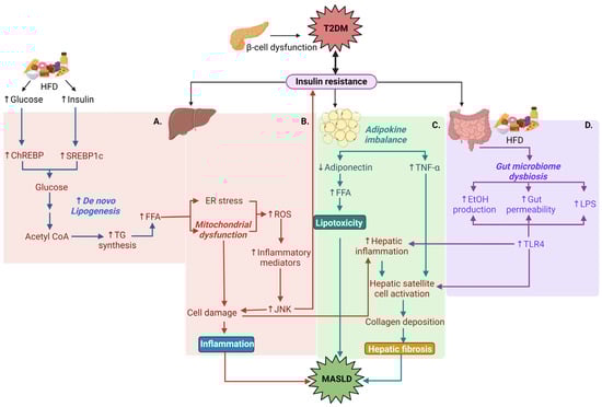 Inflammation, lipotoxicity and fibrosis contribute to the pathophysiological relationships between T2DM and MASLD. β-cell dysfunction causes IR in T2DM, followed by organ-specific pathology. (A) A chronic high-fat diet (HFD) can lead to IR, with increased glucose and insulin but blunted downstream receptor signaling, resulting in sustained elevated blood glucose. Glucose and insulin promote de novo lipogenesis through the activation of ChREBP and SREBP1c, respectively, to produce free fatty acids (FFAs). (B) Increased hepatic FFA causes mitochondrial dysfunction and ER stress followed by the rise of reactive oxygen species (ROS) and inflammatory mediators. The activation of JNK signaling by these mediators can cause hepatic cell damage and lead to inflammation; JNK signaling also decreases insulin sensitivity. (C) The development of IR is also related to alterations in adipokines secreted from adipose tissue. Decreased adiponectin induces lipotoxicity by increasing FFA, while increased inflammatory TNF-α drives hepatic satellite cell activation, leading to hepatic fibrosis due to excess collagen deposition. (D) Finally, chronic HFD affects the gut microbiota. Increased gut permeability and bacterial cellular lipopolysaccharide (LPS) or ethanol production due to dysbiosis leads to an increase in hepatic toll-like receptor 4 activation and subsequent inflammation and fibrogenesis in the liver. Red: hepatic pathways; green: adipocyte pathways; purple: intestinal pathways.