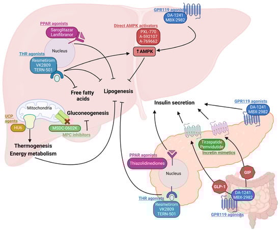 Novel treatment approaches common to T2DM and MASLD. PPAR agonists and THR agonists act to reduce hepatic free fatty acids and subsequent lipogenesis. AMPK activation is targeted via direct agonists or indirectly through THR agonists and GPR119 agonists to reduce lipogenesis. Mitochondrial targeting increases thermogenesis and reduces gluconeogenesis to ultimately reduce lipogenesis and steatosis in the liver. In the pancreas, PPAR and THR agonists act to increase insulin secretion and reduce hepatic lipogenesis. In the distal small intestine, GRP119 agonists as well as incretin mimetics potently stimulate insulin release and promote weight loss.