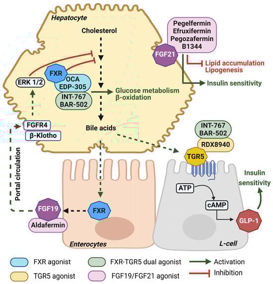 Bile-acid-based treatments for MASLD. Bile acids are synthesized from cholesterol and are released into the duodenum post-prandially to aid in nutrient and fat digestion. Bile acids also activate the receptors FXR and TGR5 to regulate metabolism. In enterocytes, the activation of FXR by bile acids or agonists induces FGF19 release which suppresses bile acid synthesis and has been shown to reduce steatosis. In hepatocytes, the activation of FXR suppresses bile acid synthesis and promotes glucose homeostasis and β-oxidation. Also in the liver, FGF21 promotes insulin sensitivity and reduces lipogenesis. In intestinal L-cells, the activation of TGR5 promotes insulin sensitivity through the release of GLP-1.