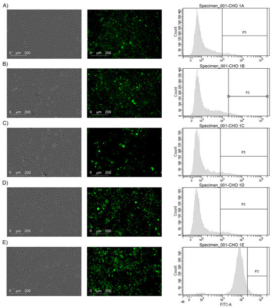 The E2 proteins were expressed in CHO-K1 cells after being transfected with DNA encoding the sequences of the five E2 proteins. The fluorescence activity of green fluorescent protein was used as a flow cytometry marker to select high-producing clones from the transfected CHO-K1 cells. The selected clones exhibited high fluorescence intensity within their cells in the culture (Figure 1).