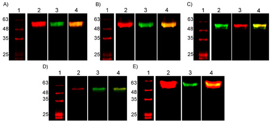 SDS-PAGE analysis was performed as described by Laemmli in 1970 [68] using 12.5% gels. For Western blots, proteins were transferred to nitrocellulose membranes of 0.45 µm (PerkinElmer, Shelton, CT, USA) using a semi-dry electroblotting TransBlot-Turbo (Bio-Rad, Hercules, CA, USA) at 0.3 A and 25 V for 30 min. After blocking with 5% skimmed milk in PBS, primary antibodies for every tag were added as corresponded, together with the anti-6xHis antibody. Secondary antibodies were added according to the specifications of primary antibodies. Infrared signals were detected using the ODYSSEY CLx imaging system and the Image Studio software version 3.1 (Li-Cor Biosciences, Lincoln, NE, USA). All antibodies used in Western blot assays are listed below (Table 2).