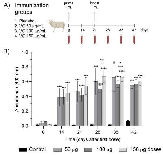Vaccine candidate’s immunogenicity in sheep. (A) Immunization protocol. (B) Time-course of humoral immune response in sheep, i.m. immunized on days 0 and 21 with 50 µg, 100 µg, and 150 µg of the vaccine candidate. Data represented means ± SD analyzed by the Friedman test, followed by Dunn’s multiple comparison test, n = 8. * p ≤ 0.05, ** p ≤ 0.01, *** p ≤ 0.001 and **** p ≤ 0.0001.