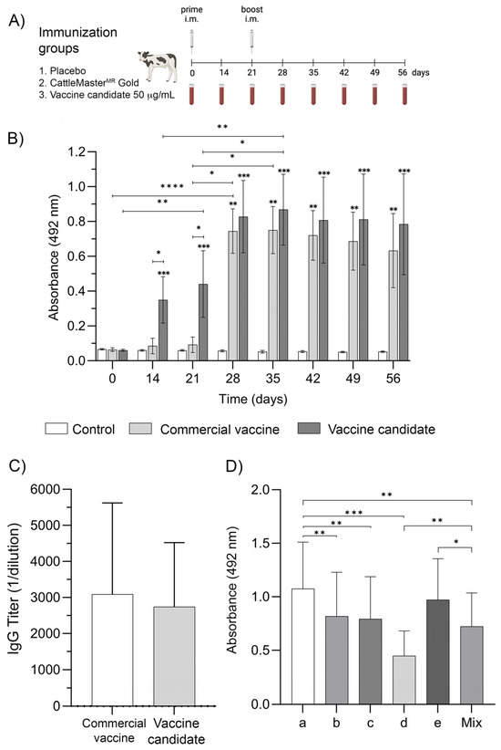 Vaccine candidate’s immunogenicity in bovines. (A) Immunization protocol. (B) Time course of humoral immune response in cattle immunized with 50 µg of the vaccine candidate. The commercial vaccine CattleMasterMR Gold FP 5 was used as the positive control. Data represent means ± SD analyzed by the Friedman test and Dunn’s multiple comparisons test. The significance between groups at each time was analyzed by the Kruskal–Wallis test and Dunn’s multiple comparisons test. (C) Antibody titers in the sera of immunized animals at day 56. Data were analyzed by the Mann–Whitney test. (D) The individual contribution of every E2 antigen to the humoral immune response. Data were analyzed by the Friedman test and Dunn’s multiple comparisons test. * p ≤ 0.05, ** p ≤ 0.01, *** p ≤ 0.001 and **** p ≤ 0.0001.
