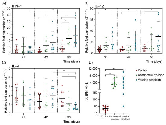 Cellular immune response by measuring cytokine transcripts or protein levels. Relative transcript expression from (A) IFN-γ, (B) IL-12, and (C) IL-4 was measured using the 2−ΔΔCt method [39]. The GAPDH gene was used as housekeeping. (D) IFN-γ in vitro determination using unstimulated and stimulated PBMC from day 56. The mean ± SD for each group (n = 8 animals) is represented. Data were analyzed by the Friedman test, followed by Dunn’s multiple comparisons test. Statistical significance between groups at each time was determined by the Kruskal–Wallis test, followed by Dunn’s multiple comparisons test. * p ≤ 0.05 and ** p ≤ 0.01.