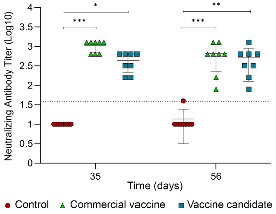 In vitro neutralization assay. Primary bovine embryo kidney cells were treated with a serum-antigen mixture using sera from days 35 and 56 after the first immunization and the reference antigen BVDV1a. Values represent the mean ± SD of 8 animals. Statistics were determined using the Wilcoxon matched-pairs signed rank test for different times. The Kruskal–Wallis test, followed by Dunn’s multiple comparison tests was used to measure the significance between groups at each time. * p ≤ 0.05, ** p ≤ 0.01, and *** p ≤ 0.001.