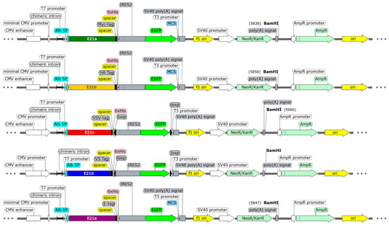 The CHO-K1 cell line was genetically modified to produce E2 proteins corresponding to the five BVDV subgenotypes previously selected. Gene sequences of bicistronic transcriptional units coding the E2 proteins attached to distinct tags for immunoidentification and the 6-His tag (1aE2-cMyc-6xHis, 1bE2-HA-6xHis, 1cE2-VSV-6xHis, 1dE2-V5-6xHis, and 1eE2-E-6xHis), followed by an internal ribosome entry site (IRES) and the fluorescent green protein (GFP), were chemically synthesized. They were inserted in the mammalian expression vector pCI-neo by the company GenScript, Piscataway NJ, USA. The resulting plasmids were named pC1-1aE2-LeGL, pCI-1bE2-LeGL, pCI-1cE2-LeGL, pCI-1dE2-LeGL, and pCI-1eE2-LeGL. Transcriptional units were controlled using the cytomegalovirus promoter/enhancer (CMV) and the SV40’s transcription termination sequence. Proteins were directed into the secretory pathway using the human albumin signal peptide, and the individual clone selection was performed using the Neomycin/Kanamycin marker (Figure 7). Plasmids were transformed and amplified in One Shot™ TOP10 Chemically Competent E. coli cells (Thermo Fisher Scientific, Waltham, MA, USA). The plasmid purification was performed using the alkaline lysis method described by Birnboim and Doly in 1979 [67]. Every plasmid was linearized with the restriction enzyme BamH1 (New England BioLabs, Ipswich, MA, USA) and cleaned using the GenElute PCR Clean-Up kit (Sigma-Aldrich, St. Louis, MO, USA) for further transfection into CHO-K1 cells using Lipofectamin 2000 (Invitrogen, Waltham, MA, USA) according to the manufacturer’s suggestions. The clone selection was performed by measuring the fluorescence intensity emitted by GFP in a flow cytometer (BD FACSAria cytometer. III Cell Sorter, Franklin Lakes, NJ, USA). At least 10,000 events were counted, and clones with the highest fluorescence intensities were chosen by cell sorting for further individual culture in 96 well plates (Thermo Fisher Scientific, Waltham, MA, USA).