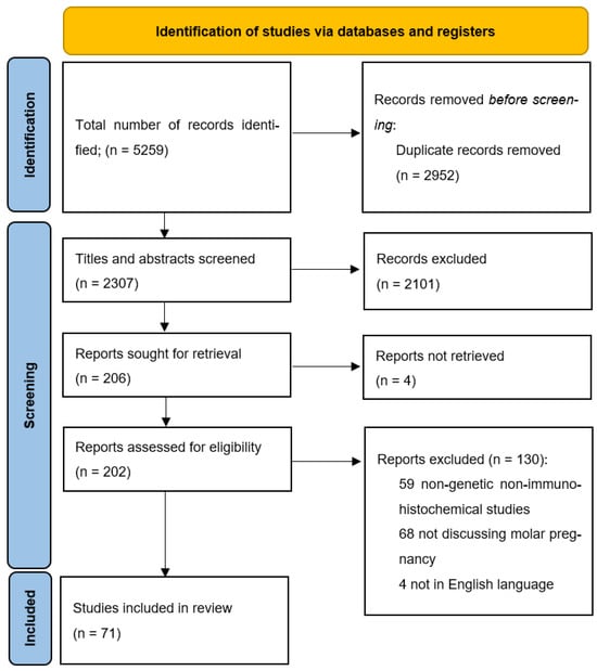 After a comprehensive search of the databases, a total of 5259 results were initially retrieved. All the abstracts and study titles were screened, and duplicates were removed. Furthermore, there were a total of 5188 studies excluded, as they either did not fit the inclusion criteria, were animal studies, included only gestational trophoblastic neoplasia, placental abnormalities other than hydatidiform mole, or did not explore the genetic basis of the disease. Eventually, 71 articles met all the criteria and were included in the review. A summary of the studies included in this review is available as Supplementary Material Table S1.