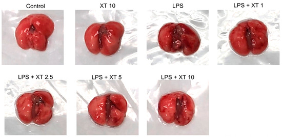 General lung appearance after LPS-induced injury and Xanthoxylin treatment. Mice received an intratracheal LPS challenge followed by intraperitoneal administration of Xanthoxylin (XT, 1, 2.5, 5, and 10 mg/kg) or saline. Lungs were collected 6 h post-LPS challenge for analysis.