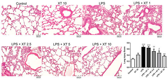 Histological examination of lung tissues stained with H&E after LPS challenge and Xanthoxylin treatment. Mice received LPS intratracheally and were then treated with Xanthoxylin (XT, 1, 2.5, 5, and 10 mg/kg) or saline intraperitoneally. Lungs were harvested 6 h post-LPS challenge for H&E staining. Representative images show ALI and histological changes (100× magnification, scar bar = 100 μm). Quantification of histologic lung injury was analyzed according to American Thoracic Society (ATS) scoring system (n = 6 per group). # p < 0.05, ## p < 0.01, ### p < 0.005 vs. control group; * p < 0.05, ** p < 0.001 vs. LPS group.
