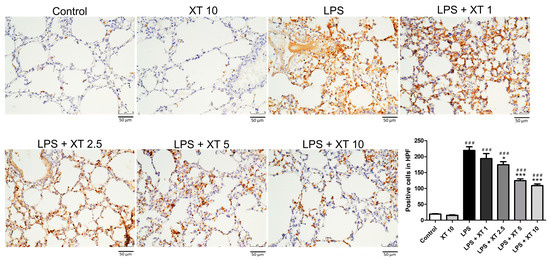 Neutrophil infiltration in lungs following LPS-induced injury and Xanthoxylin treatment. Mice were challenged with LPS intratracheally and treated with Xanthoxylin (XT, 1, 2.5, 5, and 10 mg/kg) or saline intraperitoneally. Lungs were collected 6 h post-LPS challenge and immunostained with Ly6G antibody (200× magnification, scar bar = 50 μm). Quantification of positive cells was analyzed under high power field (HPF). Data are mean ± SD (n = 6 per group). ### p < 0.005 vs. control group; * p < 0.05, *** p < 0.005 vs. LPS group.